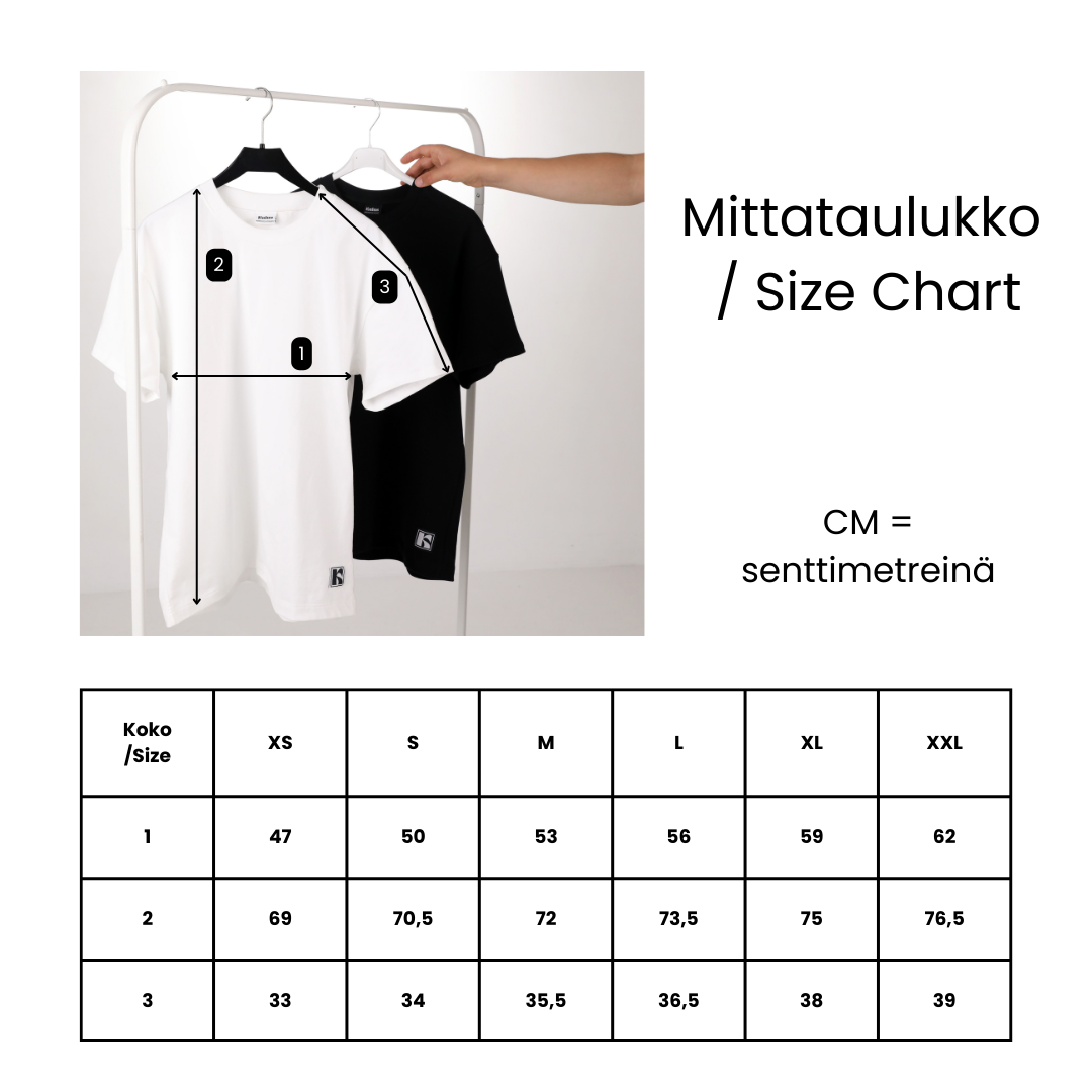 T-paita on istuvuudeltaan rento ja väljä. Toisen kuvan malli on 165cm pitkä ja käyttää kokoa S. Kolmannen kuvan malli on 180cm pitkä ja käyttää kokoa M.